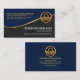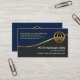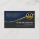 A faux gold wave that stretches across the card's face demarcates a blue layer against its grey counterpart below. Riding this gold wave is a gold "water wave life buoy" logo you can use. Over at the top corner is the business name and its contact details. Below the gold logo are your prestigious name, job title and a slogan caption to publicise your services. Change the caption remarks to the slogan to suit your own needs.