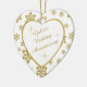 This is an elegant ornament to celebrate a couple's 50th Wedding Anniversary, either at the time of the celebration or for Christmas. It features a white heart framed in gold faux glitter on a matching gold glitter snowflake on white background. Inside the white heart is your text in matching gold, plus twinkling gold star images. The text is fully customisable, so you may make it say whatever you'd like. There is a 2nd text field on the back, which has the same gold snowflake border and inside image. This is a special family keepsake gift that will be treasured forever. *Please note - the image is printed, and the ornament does not contain glitter.*