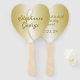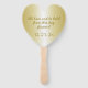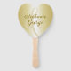 Heart shaped wedding fans in gold colour. A large “and” sign holds the first names of the couple on one side with saying and date on the other. Script text is dark golden brown. “To have and to hold from this day forward” is the saying on the back, with the date of wedding at the bottom. You may change the shape to any other except the rectangle.