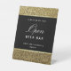 An elegant and chic Open Bar table pedestal sign, featuring a luxurious glitter gold, black, and white design with modern calligraphy script.