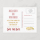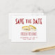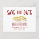 Red, White and Gold Modern Simple Save the Date Postcards with photo of gold wedding rings. Customise with your personal wedding announcement information. A beautiful, elegant design using fun font styles for text combined with two yellow gold and silver wedding bands.