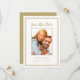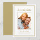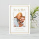 This gold and white photo save‑the‑date card features a modern double‑border frame surrounding your engagement photo for a clean, elegant presentation. Gold colour calligraphy adds a sophisticated touch on a crisp white background, and the back of the card is finished in solid gold for a coordinated look. This portrait layout works beautifully with close‑up or full‑length photos. Personalise with your wedding details, and feel free to reach out for custom requests.