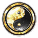 Jewellery, gold and black yin yang symbol on a black background. Gold yin yang.