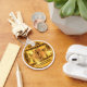 The top and bottom of the circular artwork feature repeating geometric patterns in black, likely zigzags or waves, which add an intricate detail and cultural significance.