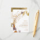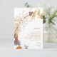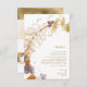 An arrangement of autumn leaves and berries in shades of gold and burgundy splashed with gold dust is the focal point for this beautiful wedding details card. The lower-case, typewritten font and modern layout make this an eye-catching way to announce important information for your wedding guests.