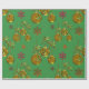 This green and gold Christmas wrap has a pattern of golden Christmas tree baubles and red and orange snowflakes, all on a festive green background.