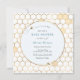 Bee-themed gold baby shower invitation featuring a gold honeycomb pattern and buzzing bees. Personalise with your information or click "Click to customise further" to edit font styles, size and colours.