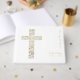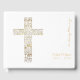 Simple, modern and elegant Christian cross with Bible verses from John (cut-out effect into white background to show the yellow gold gradient colour background behind). Design on hard cover guest book . You can easily change name and date (colour, font, size and position) by clicking the personalise or customise button. Available in copper colour and for the colour of your choice, available in binder with filler pages too. Matching memorial service invitations, sympathy thank you photo cards (flat card and note card) and more...