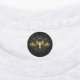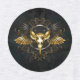 Artistically drawn, symmetrical, composition of black and gold, bird wings, golden, bird skull decorated with gilded pattern on dark, textured background.Gothic style