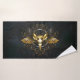 Artistically drawn, symmetrical, composition of black and gold, bird wings, golden, bird skull decorated with gilded pattern on dark, textured background.Gothic style