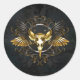 Artistically drawn, symmetrical, composition of black and gold, bird wings, golden, bird skull decorated with gilded pattern on dark, textured background.Gothic style