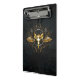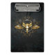 Artistically drawn, symmetrical, composition of black and gold, bird wings, golden, bird skull decorated with gilded pattern on dark, textured background.Gothic style