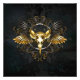 Artistically drawn, symmetrical, composition of black and gold, bird wings, golden, bird skull decorated with gilded pattern on dark, textured background.Gothic style