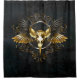 Artistically drawn, symmetrical, composition of black and gold, bird wings, golden, bird skull decorated with gilded pattern on dark, textured background.Gothic style