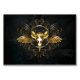 Artistically drawn, symmetrical, composition of black and gold, bird wings, golden, bird skull decorated with gilded pattern on dark, textured background.Gothic style