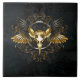 Artistically drawn, symmetrical, composition of black and gold, bird wings, golden, bird skull decorated with gilded pattern on dark, textured background.Gothic style