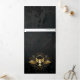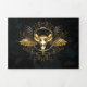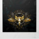 Artistically drawn, symmetrical, composition of black and gold, bird wings, golden, bird skull decorated with gilded pattern on dark, textured background.Gothic style