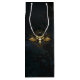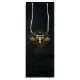 Artistically drawn, symmetrical, composition of black and gold, bird wings, golden, bird skull decorated with gilded pattern on dark, textured background.Gothic style