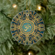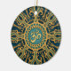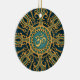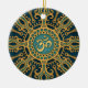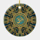 An Aum or Om symbol sits inside of a elaborate sun design. The star is made up of eight stylised rays that stretch out like spokes from a circle in the centre. The intricate lines and dots are coloured with a golden yellow that is highlighted to give the pattern a light shine on the surface. The background is painted deep blue that can be seen through the negative space of the sun. A shadow appears just beneath the design making it seem to float just above the surface of the ornament. This stylish design is a striking representation of this spiritual symbol.