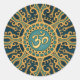An Aum or Om symbol sits inside of a elaborate sun design. The star is made up of eight stylised rays that stretch out like spokes from a circle in the centre. The intricate lines and dots are coloured with a golden yellow that is highlighted to give the pattern a light shine on the surface. The background is painted deep blue that can be seen through the negative space of the sun. A shadow appears just beneath the design making it seem to float just above the surface of the sticker. This stylish design is a striking representation of this spiritual symbol.