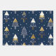 This design features an elegant navy blue background contrasting with a repeating pattern of abstract pine trees The trees utilize a mix of stunning textures: Shimmering faux gold glitter,Crisp white line art,White polka dots,Geometric vertical stripes