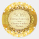 Celebrate the 50th anniversary couple with a sticker that celebrates this achievement in style. Faux golden bokeh images sprinkle down against a golden gradient background. The main text is highlighted in an ornament held on by a gold ribbon image. Great as envelope seals or favours. Available in alternate colours with matching products.