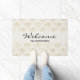 A welcome doormat with an elegant pattern with gold coloured bumble bees in a repeating pattern on a cream coloured background.
