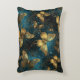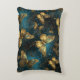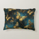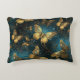 An elegant accent pillow with a butterflies pattern in glittering golden hues and glowing blues.