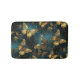 An elegant bath mat with a butterflies pattern in glittering golden hues and glowing blues.