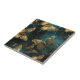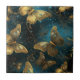 An elegant ceramic tile with a butterflies pattern in glittering golden hues and glowing blues.