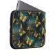 An elegant laptop bag with a butterflies pattern in glittering golden hues and glowing blues.