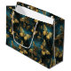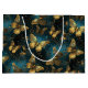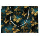 An elegant large gift bag with a butterflies pattern in glittering golden hues and glowing blues.