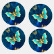 Flying gold, jewellery butterfly on blue textural background. Design with butterflies.