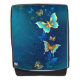 Flying gold, jewellery butterfly on blue textural background. Design with butterflies.