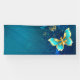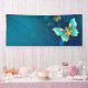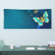 Flying gold, jewellery butterfly on blue textural background. Design with butterflies.