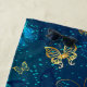 Flying gold, jewellery butterfly on blue textural background. Design with butterflies.