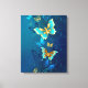 Flying gold, jewellery butterfly on blue textural background. Design with butterflies.