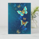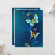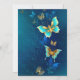 Flying gold, jewellery butterfly on blue textural background. Design with butterflies.