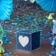 Flying gold, jewellery butterfly on blue textural background. Design with butterflies.
