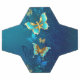 Flying gold, jewellery butterfly on blue textural background. Design with butterflies.