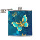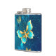 Flying gold, jewellery butterfly on blue textural background. Design with butterflies.