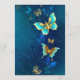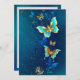Flying gold, jewellery butterfly on blue textural background. Design with butterflies.