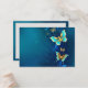 Flying gold, jewellery butterfly on blue textural background. Design with butterflies.