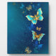Flying gold, jewelry butterfly on blue textural background. Design with butterflies.
