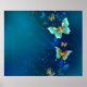 Flying gold, jewellery butterfly on blue textural background. Design with butterflies.