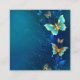 Flying gold, jewellery butterfly on blue textural background. Design with butterflies.