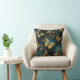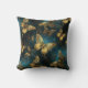 An elegant throw pillow with a butterflies pattern in glittering golden hues and glowing blues.
