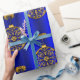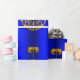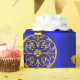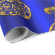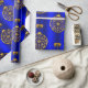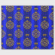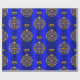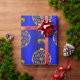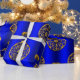 A decorative Christmas wrap featuring a pattern of golden Christmas decorations on a colourful, metallic blue background to add a sophisticated and festive touch to your gift wrapping this holiday season.