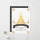 A stunning Christmas card featuring a white front with gold snowflakes, reindeer and a centre Christmas tree. A black banner holds the message "Merry Christmas". The back of the card picks up the black and features Santa on his sleigh.