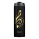 Modern shiny gold treble clef with notes on black background. Optional monogram